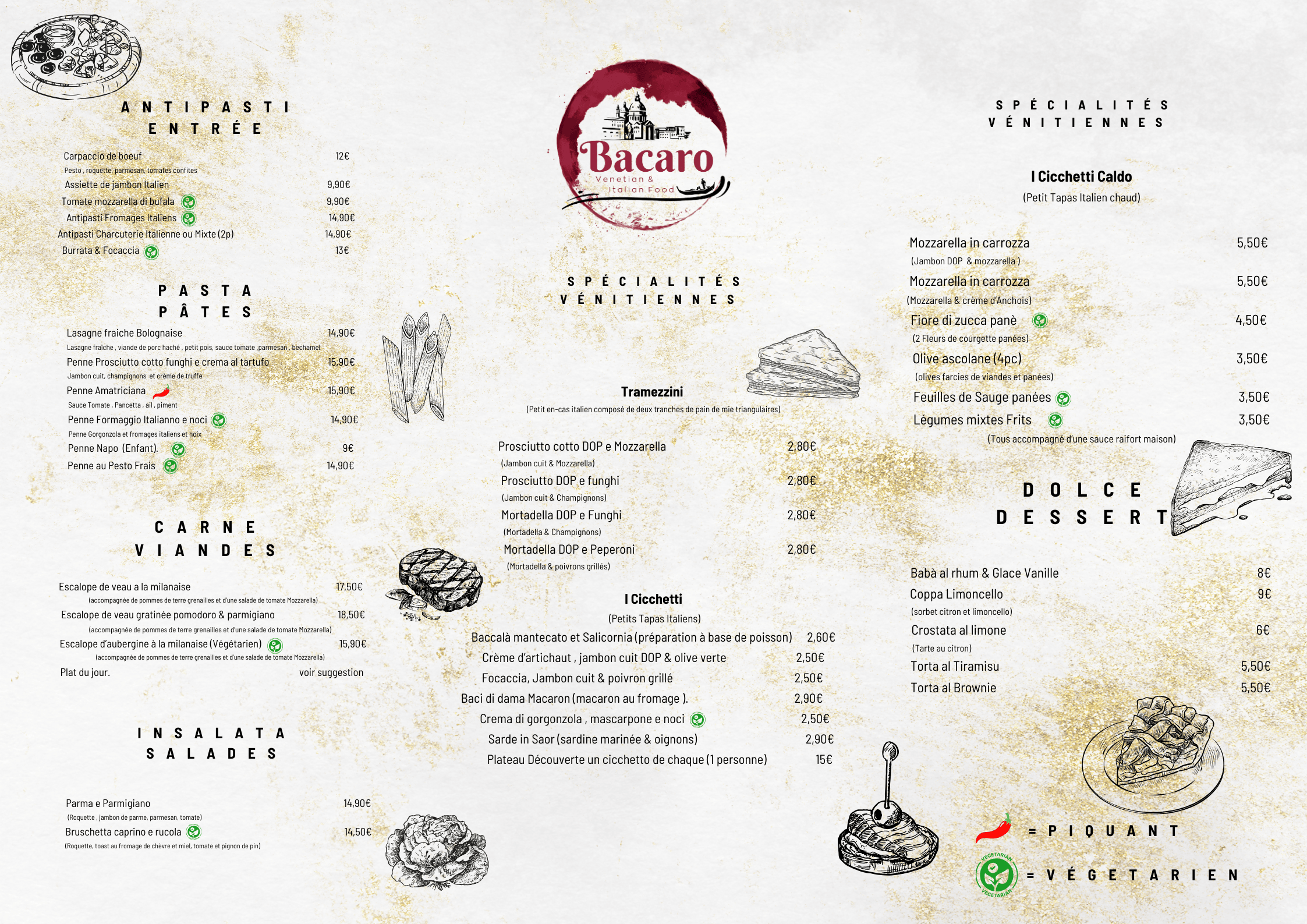 Au Bacaro, chaque plat raconte une histoire : pâtes artisanales, cicchetti, antipasti et autres spécialités vénitiennes sont préparés avec passion, dans le respect des traditions italiennes.